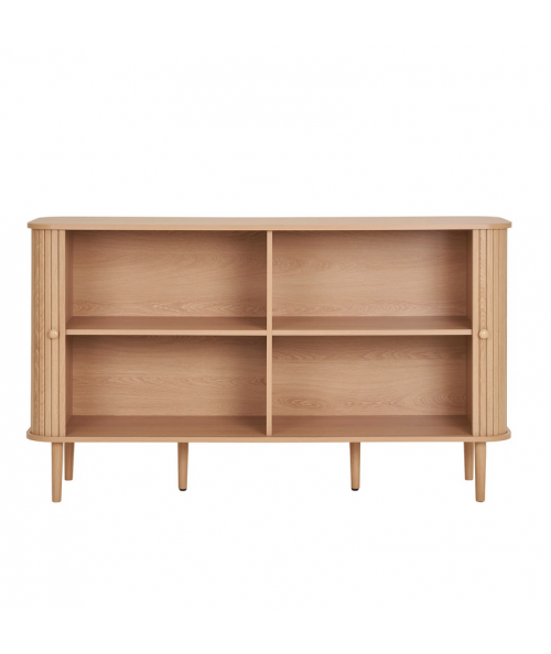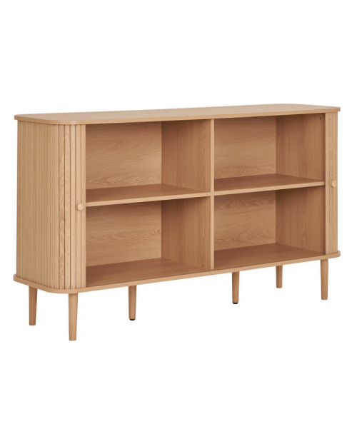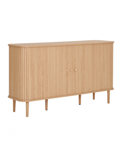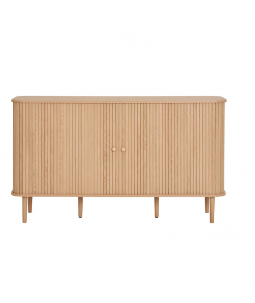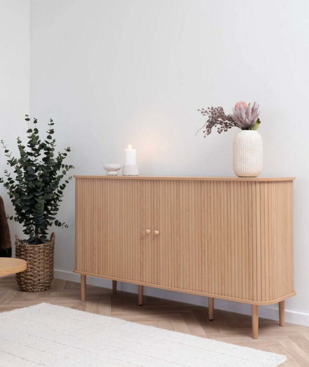 Nikko skænken er fremstillet i en kombination af MDF og massivt fyrretræ, hvilket giver et let og elegant udtryk, samtidig med at den er solid og holdbar. Den naturlige træfarve og de smukt riflede låger tilfører varme og karakter til rummet, mens de afrundede hjørner understreger et moderne, stilrent look.