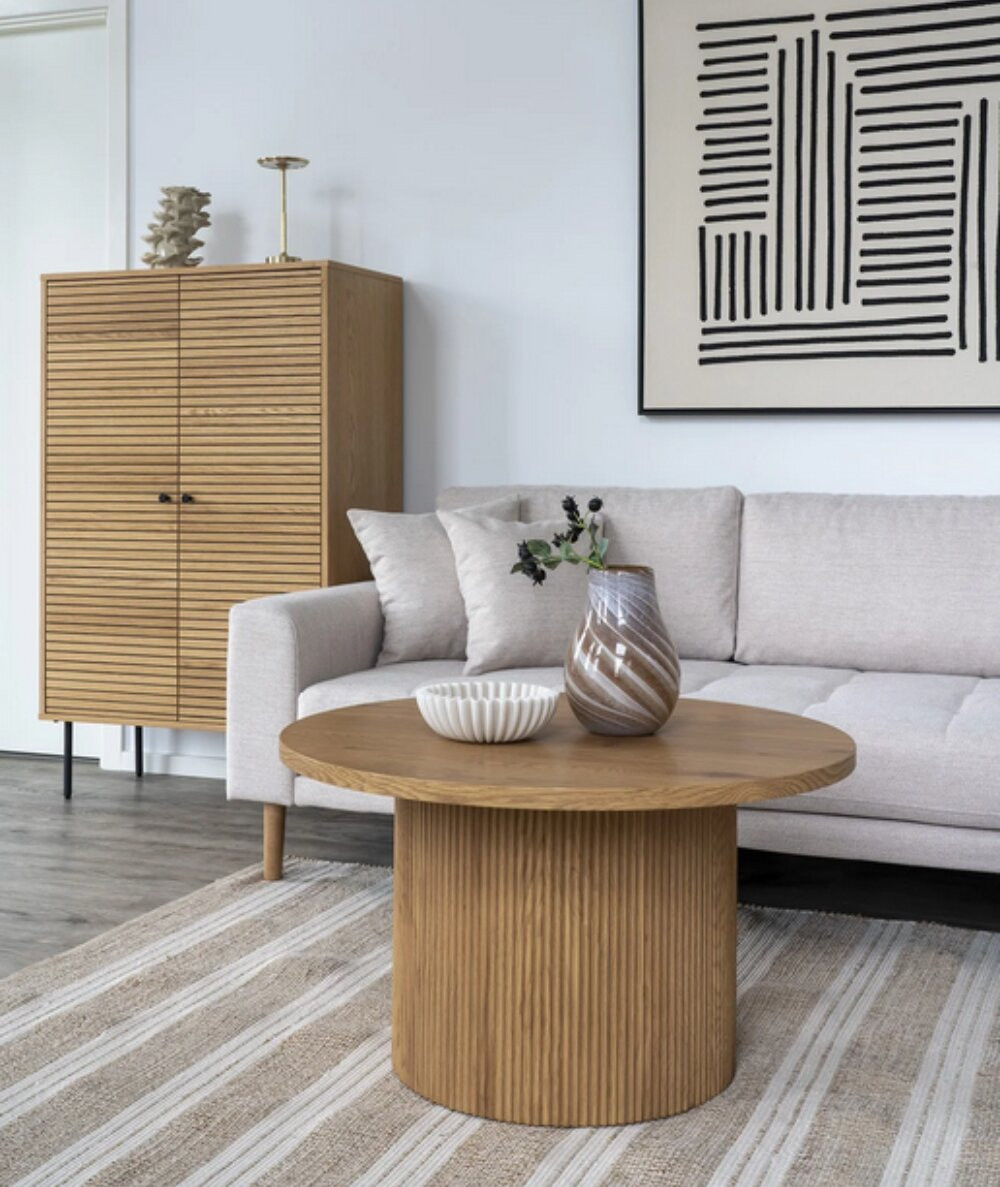 Dette sofabord komplementerer perfekt de øvrige møbler i rummet, som ses på billedet. Den lyse sofa med de bløde puder og det matchende skab i baggrunden skaber en harmonisk og sammenhængende helhed. Den enkle vægdekoration med geometriske mønstre tilføjer et kunstnerisk touch uden at overdøve de naturlige elementer i rummet. Sofabordet er en fremragende tilføjelse til ethvert hjem, der værdsætter både æstetik og funktionalitet. Den naturlige farve, det enkle design og den robuste konstruktion gør dette bord til et tidløst møbel, der vil kunne nydes i mange år fremover.