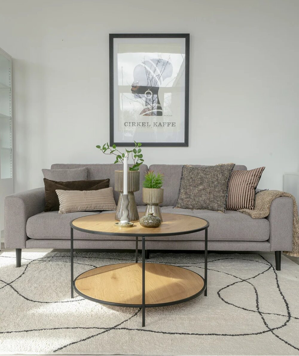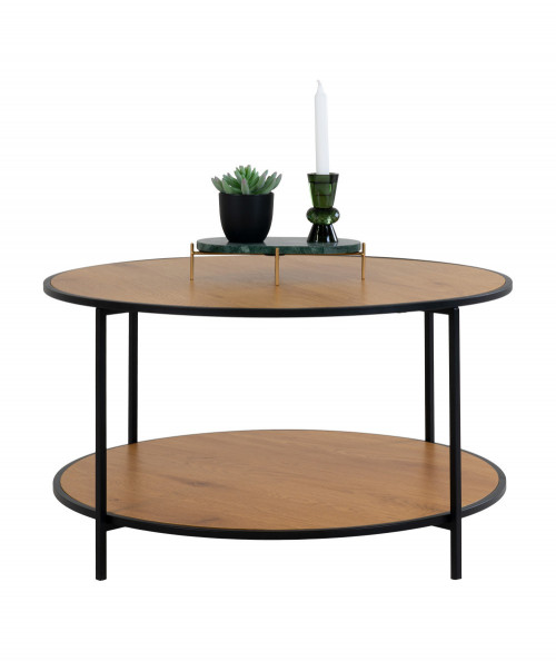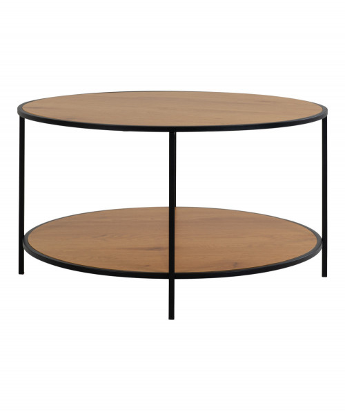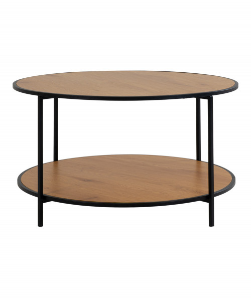 Det runde Vita sofabord er lavet i stål, spånplade og melaminfolie og har et egetræslook. Sofabordet har en sort ramme, som giver en flot kontrast til bordpladen. Sofabordet er oplagt til stuen eller teenagerværelset og måler B80 x L80 x H45 cm.