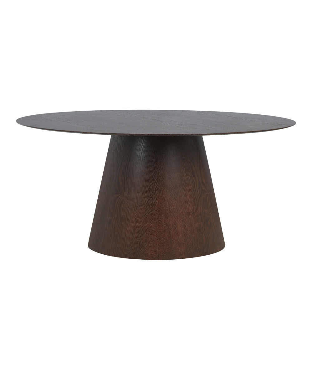 Den runde bordplade skaber en naturlig ramme om hyggelige middage og samtaler, hvor alle er en del af fællesskabet. Den mørke egetræsfinish tilfører dybde og eksklusivitet, samtidig med at træets smukke struktur fremhæves på elegant vis.