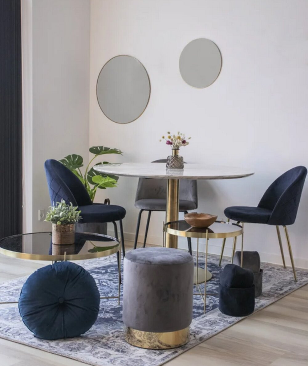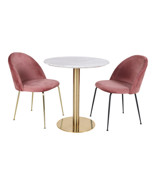 Elegant Bolzano spisebord fra House Nordic. Det flotte Bolzano spisebord har en rund bordplade i marmor look og ben i messing look, hvilket giver spisebordet et slankt og luksuriøst udtryk, som passer ind i tidens trend. For et komplet og fuldendt udtryk, kan man med fordel matche spisebordet med de moderne velour stole, der også forhandles her på siden. Spisebordet fås i 3 størrelser og i serien findes også både barbord og sofabord.