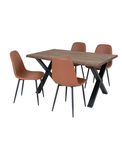 Spisebordet har en praktisk længde på 140 cm, hvilket gør det ideelt til både mindre og mellemstore spisestuer. Bordets X-formede metalben sikrer stabilitet og tilfører en unik visuel kontrast til den varme træstruktur. Spisebordsstole har en siddehøjde på 47 cm og en siddekomfort, der gør lange middage endnu mere behagelige.