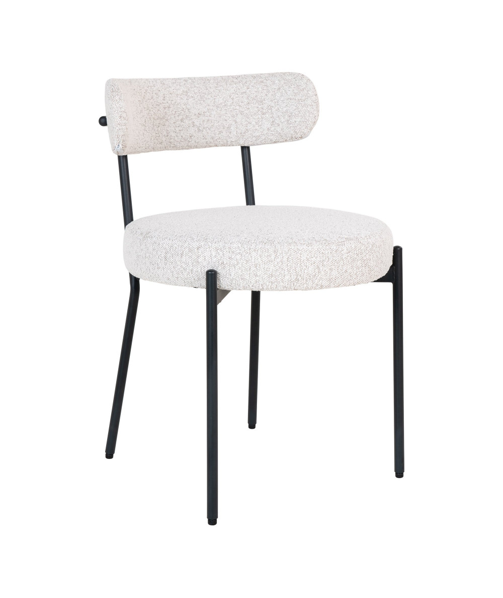 Giv dit spiseområde et moderne og elegant præg med denne stilfulde spisebordsstol i hvid bouclé. Stolen er designet til at kombinere æstetik og komfort, hvilket gør den til det perfekte valg for både dagligdagsbrug og specielle lejligheder. Sædet og ryglænet er betrukket med blød og luksuriøs polyester bouclé i en smuk hvid nuance, mens stellet er lavet af robust stål. De sorte metalben giver stolen et moderne udseende og sikrer stabilitet og holdbarhed. Den runde sædeform og den komfortable ryglæn giver optimal siddekomfort.