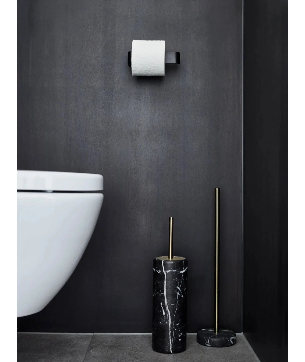 Den flotte toiletpapirholder er fra Aquanova og er en del af Nero serien, som også består af sæbeskål, tandkrus, spejl og toiletbørste. Toiletpapirholderen har et elegant udtryk, som passer smukt til køkkenbordet ved håndvasken. Toiletpapirholderen er håndlavet i marmor, hvilket gør toiletpapirholderen unik, da der ikke er to der er ens. Toiletpapirholderens stang er lavet i rustfri stål og har en messing overflade, som giver et eksklusivt udtryk. Fordi toiletpapirholderen er lavet i rustfrit stål, så vil den aldrig ruste. Den har et flot design og passer flot ind i den skandinaviske indretningsstil.