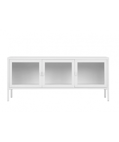 TV-bænken er designet med tre glaslåger, der ikke kun giver et let og luftigt udseende, men også beskytter dit udstyr mod støv, samtidig med at det er let tilgængeligt. De hvide metalben løfter bænken fra gulvet, hvilket skaber en svævende følelse og gør det nemt at rengøre under den.