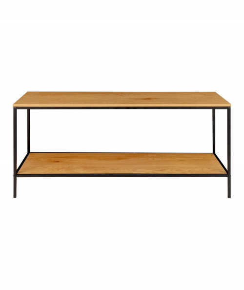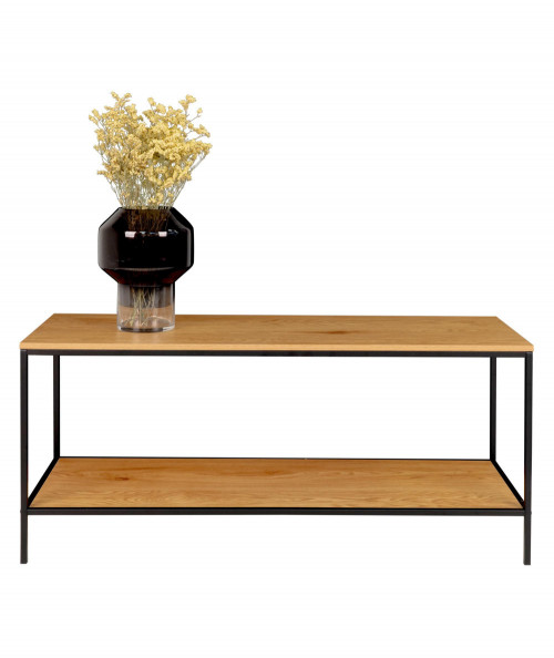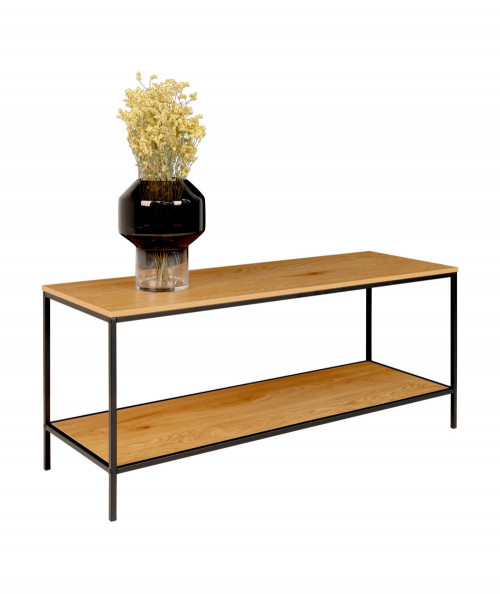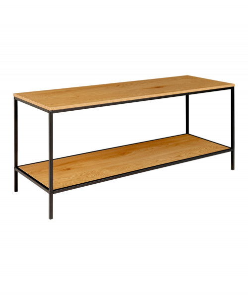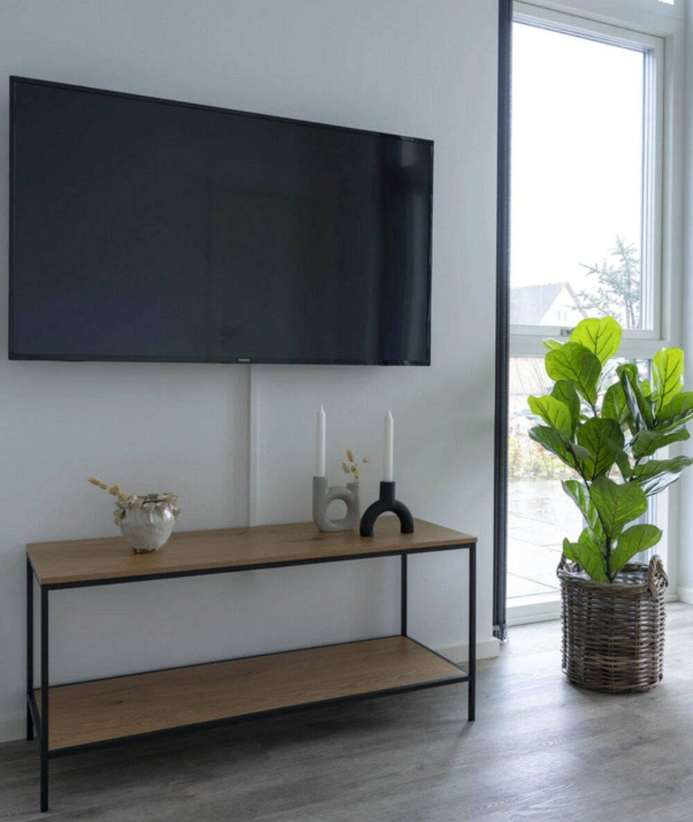 Vita TV-bord med sort ramme og to egetræslook hylder