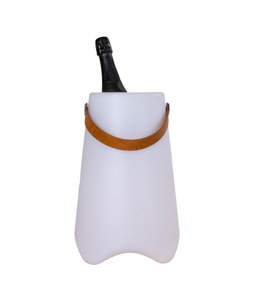 Se engang denne fine LED vinkøler med strop af emitteret læder - er den ikke fin?. Elsker du, at få serveret kold vin, så er denne vinkøler da en oplagt ide til haven eller terrassen. Den har to funktioner og det er, at holde vinen kold, men også at give lys til de skønne sommeraftener. Så det er en vinkøler der samtidig fungerer som en lampe.