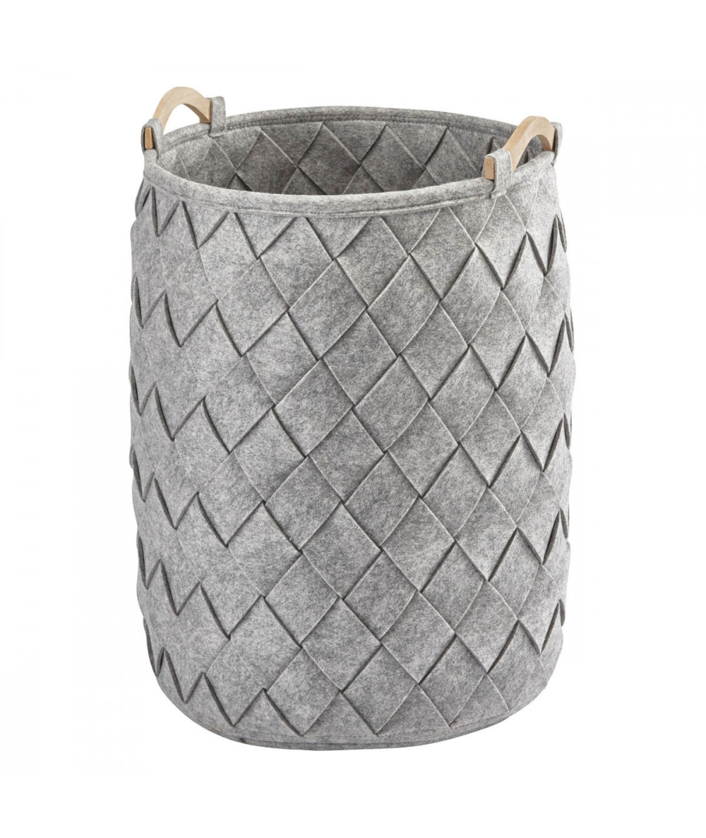 En trendy vasketøjskurv fra Aquanova. Et enkelt design med fine detaljer. Kurven er lavet i lækkert filtmateriale og håndtaget er lavet i flot gran. de flettede filbaner skaber et eksklusivt design og passer ind i det nordiske skandinaviske hjem.