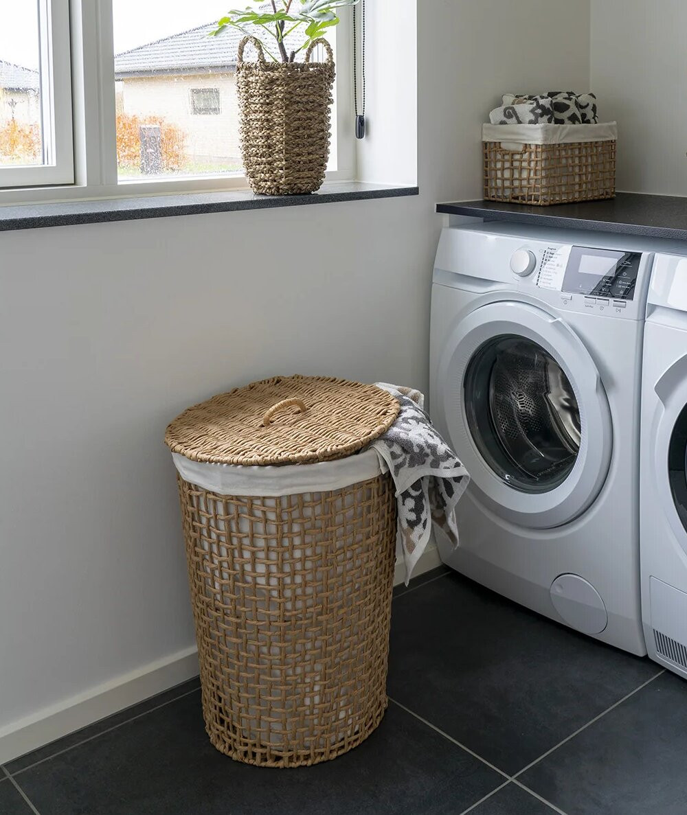 Den hvide inderpose giver en flot kontrast til den lysebrune kurv, samtidig med at den beskytter dit tøj. Pomal Vasketøjskurv er ikke kun praktisk til opbevaring af tøj, men fungerer også som en dekorativ tilføjelse til badeværelset eller soveværelset.