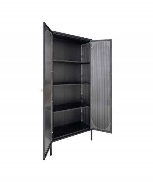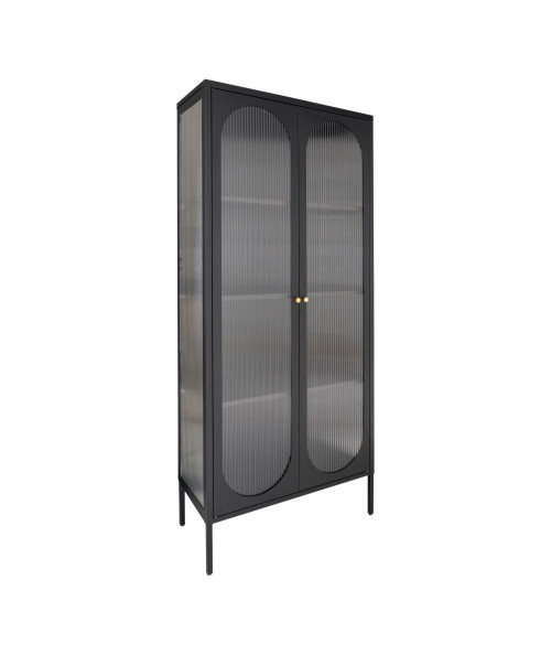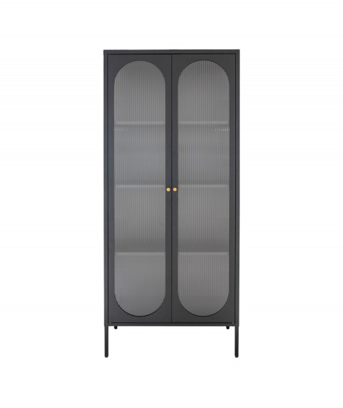 Ønsker du et flot vitrineskab i dit hjem så se engang dette flotte og elegante vitrineskab fra House Nordic. Det har riflede glasdøre og elegante guldhåndtag, som står smukt til den sorte farve. Vitrineskabet har dobbelt låge og har et raffineret look og passer ind i de fleste hjem. Vitrineskabet fås også med en låge.