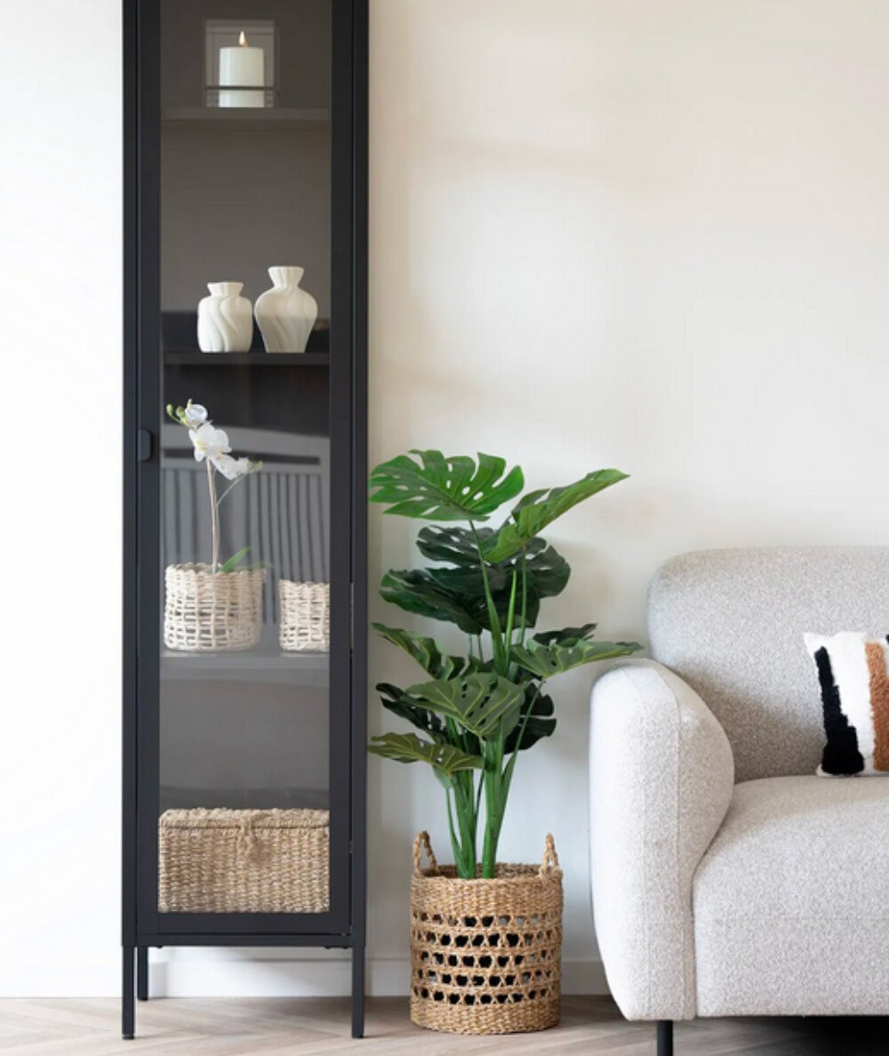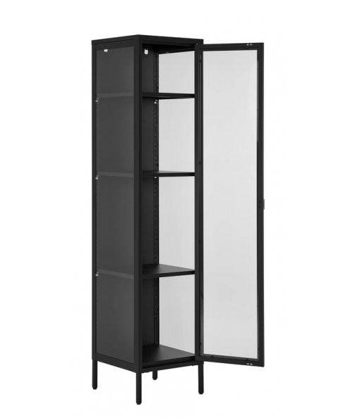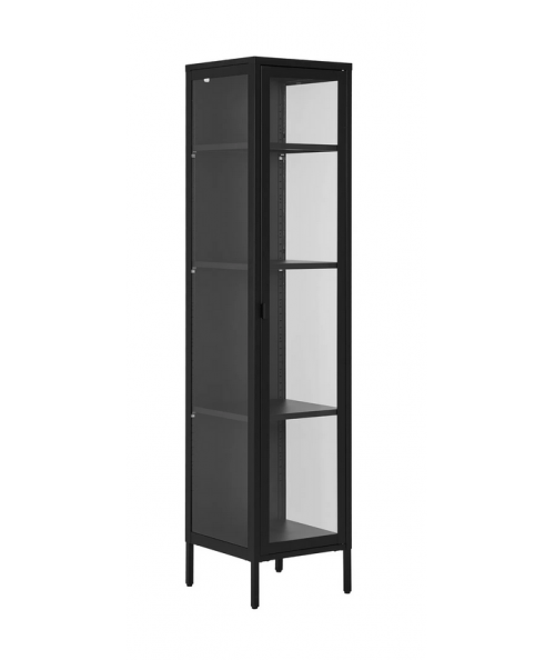 Vores smalle Brisbane vitrineskab er en elegant og pladsbesparende løsning til opbevaring og udstilling af dine yndlingsgenstande. Dette vitrineskab måler 40x35x180 cm og er designet med en enkelt glaslåge, der giver et let og stilrent udtryk. Skabet er fremstillet af sort stål, hvilket giver det en robust konstruktion og et moderne, minimalistisk look.