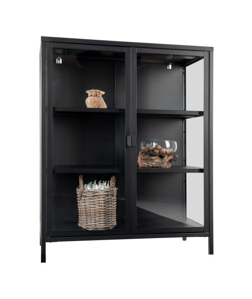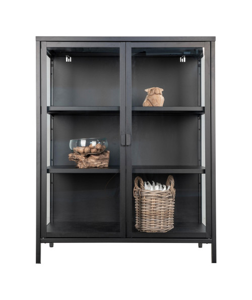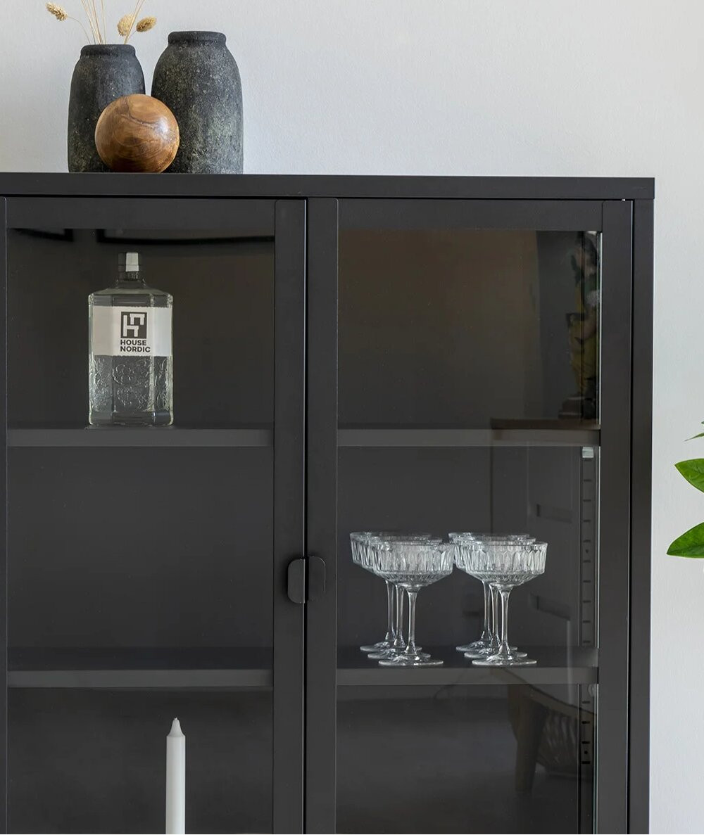 Et smart Vitrineskab i sort med glaslåger. Vitrineskabet har et enkelt og flot udtryk og du har mulighed for, at vise dine nips, tallerkner, glas mm. frem i din indretning.