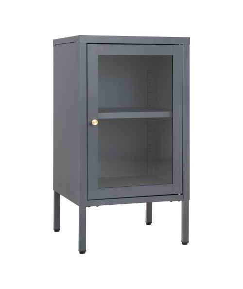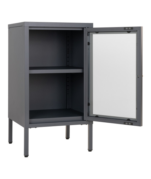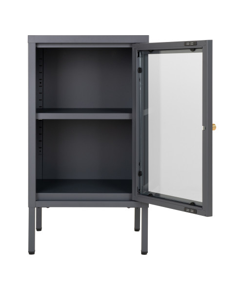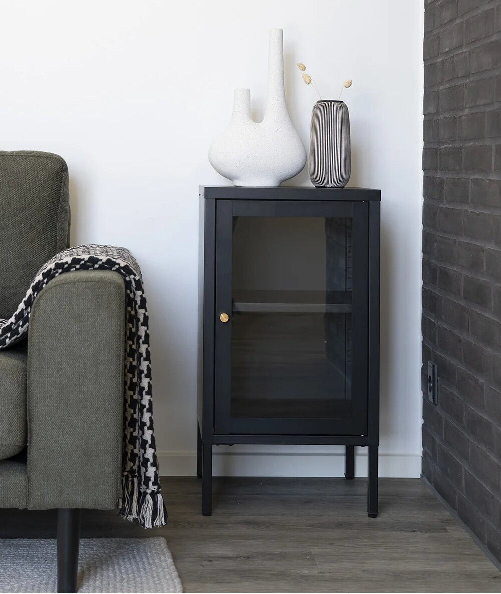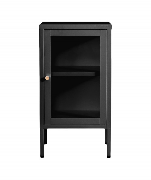 Den flotte og elegante Charline skab er lavet i sort metal og har 1 glaslåge med to hylder. Det flotte skab har et messing greb, som virkelig kommer til sin ret grundet møblets sorte farve. Skabet har et enkelt og flot design og vil passe flot sammen med skænk og tv bænk i samme serie.