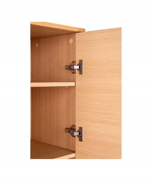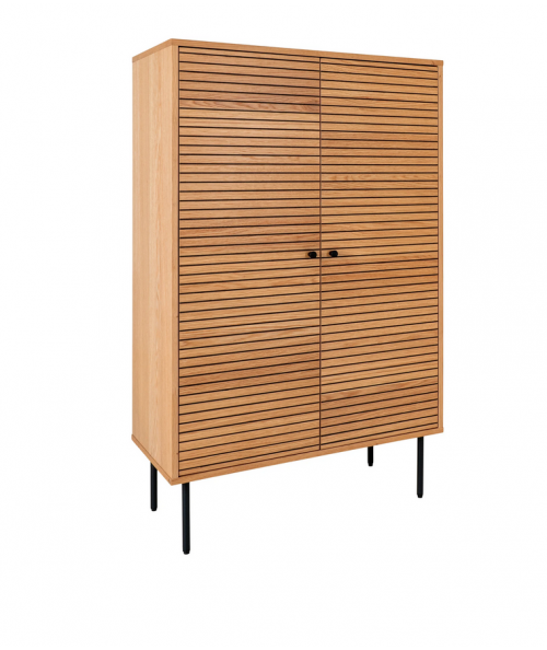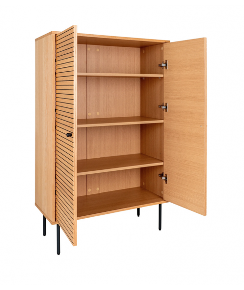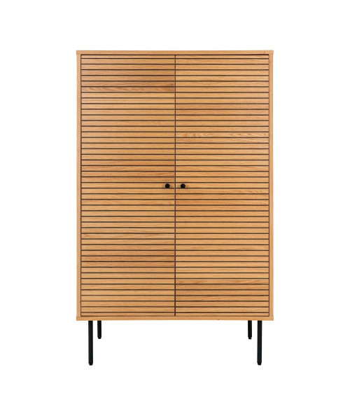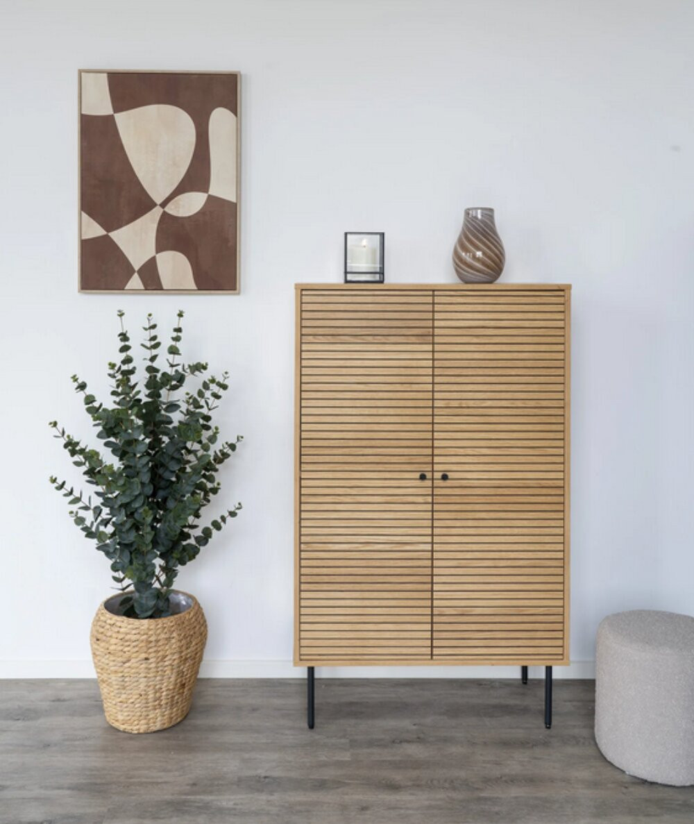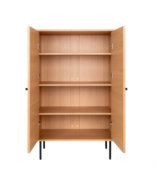 Skab hyggelig nordisk stemning i hjemmet med vores fine egefinér vitrineskab. Med sine to låger og slanke sorte metalben er dette møbel en perfekt balance mellem funktion og æstetik. Den varme træglød tilføjer en indbydende atmosfære til enhver indretning. Skab en hyggelig stemning i stuen eller køkkenet og skab orden med dine yndlingsgenstande i dette smukke, nordisk inspirerede vitrineskab.