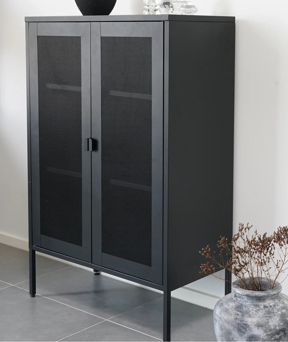 Elsker du den enkelte og minimalistiske indretningsstil men lidt kant så se engang dette fine Vitrineskab i sort med trådnetslåger. Skabet har et enkelt og fint udtryk som klæder ethvert hjem.