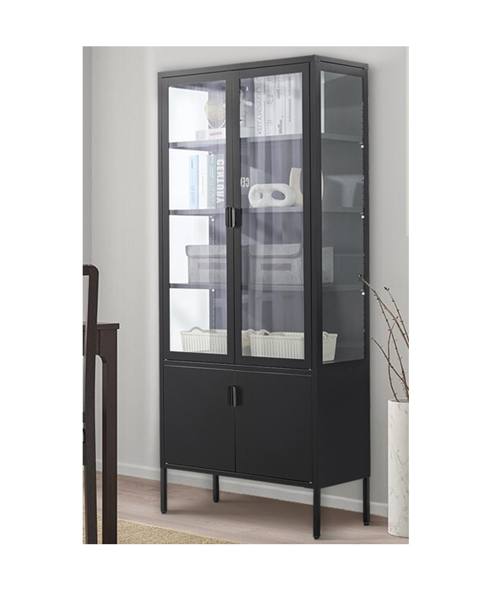 Det sorte og elegante vitrineskab har et flot design. Vitrineskabet har 4 hylder, to glas låger og to metallåger, som giver mulighed for at opmagasinere nogle ting samt udstille dine nipsting såsom vaser, skåle osv. Det er et flot vitrineskab, som du både kan have stående i stuen men også i køkkenalrummet.